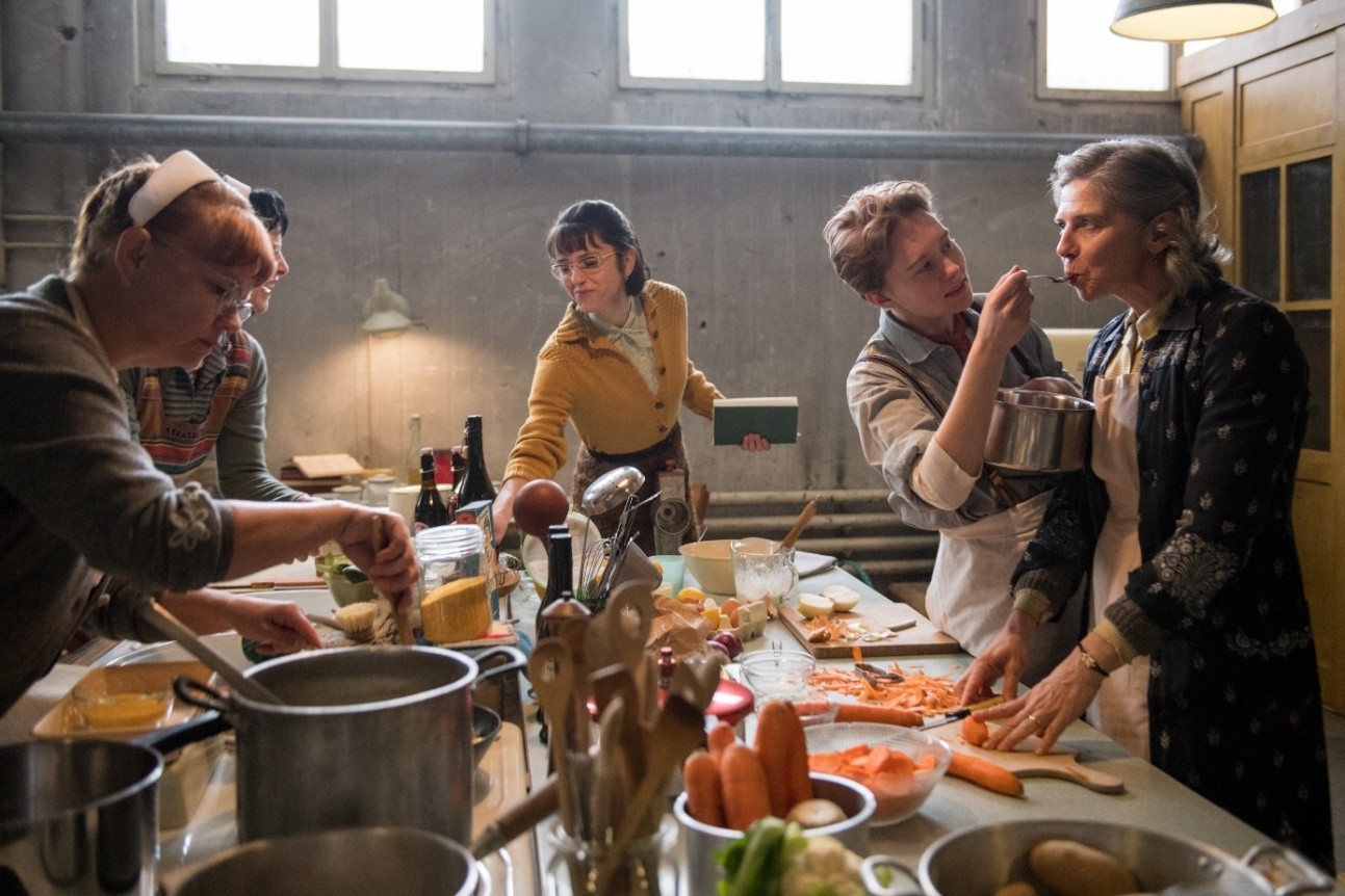 Johanna Maag erzählt weiter von einem guten Verhältnis im Team. Solche intensiven Spannungen zwischen Männern und Frauen, wie im Film dargestellt, erlebte sie nicht. Dort wird in der ersten Szene gezeigt, wie Creola mit wenig Erfolg ihre Idee einer fiktiven Köchin dem Chef vorstellt, woraufhin ein neuer männlicher Angestellter die Idee stiehlt und viel Zustimmung erntet. Dass Creola als Frau in der Arbeitswelt weniger ernst genommen wird, bleibt durch den ganzen Film hindurch ein Problem, und so muss sie auch um alle zusätzlichen Mittel für Betty Bossi kämpfen. Johanna Maag berichtet mir zwar nicht von solchen Erfahrungen, aufgefallen ist ihr jedoch ein gewisses Konkurrenzverhältnis zwischen einigen Frauen. Dieses sei jedoch nie so stark ausgeprägt gewesen wie im Film. Dort wird dies mittels Frauenfiguren gezeigt, die verschieden mit dem Patriarchat umgehen und dadurch aneinandergeraten: Sophie (Morgane Ferru), eine Büroangestellte, die den Männern schmeichelt und die eigenen Ansprüche tief hält, verurteilt das konfrontative Verhalten von Maxi Bossert. Diese wiederum macht sich über Sophies Unterwürfigkeit lustig.